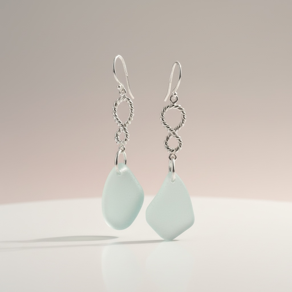 These earrings feature smooth, sea-green glass paired with sculpted sterling silver details, creating a fluid silhouette inspired by the rhythm of the tide. The soft translucence catches the light with a gentle glow, echoing the calm movement of water.